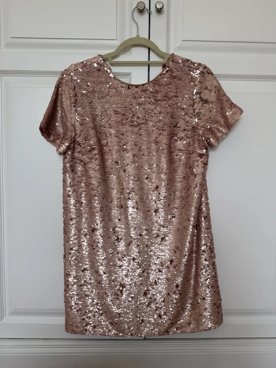 Vestido corto con lentejuelas en color cobre. Posee mangas cortas y escote en V pronunciado en la espalda.