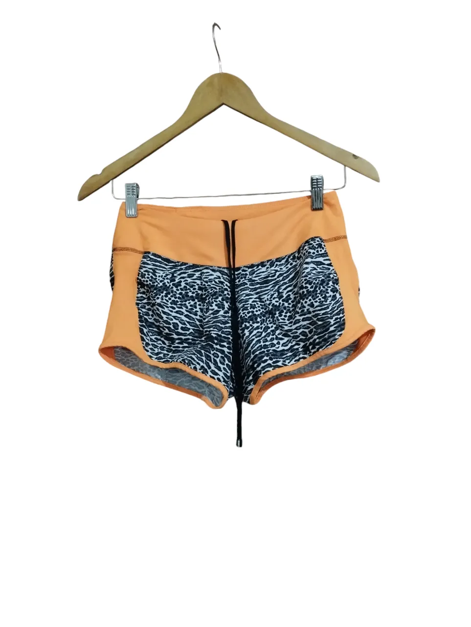 Shorts deportivos naranjas con estampa animal print en blanco y negro. Cierre frontal con tirador.