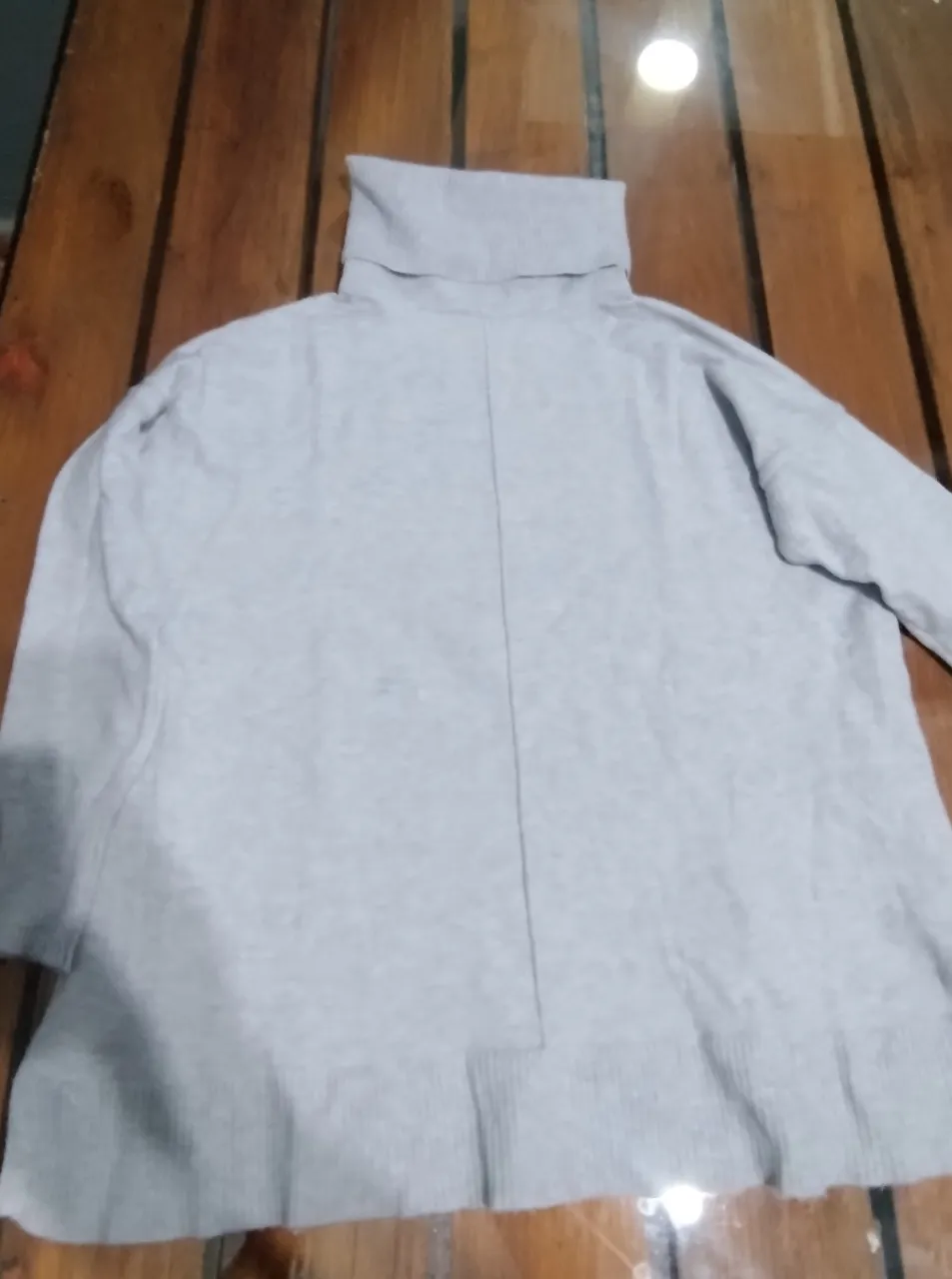 Sweater gris con cuello alto y manga larga. Posee costura central en la espalda y terminación de puño en la parte inferior. Talle M amplio, sisa 50 cm, largo 56 cm, tiene algún desgaste por el roce, pero está como nuevo, no tiene bolitas.