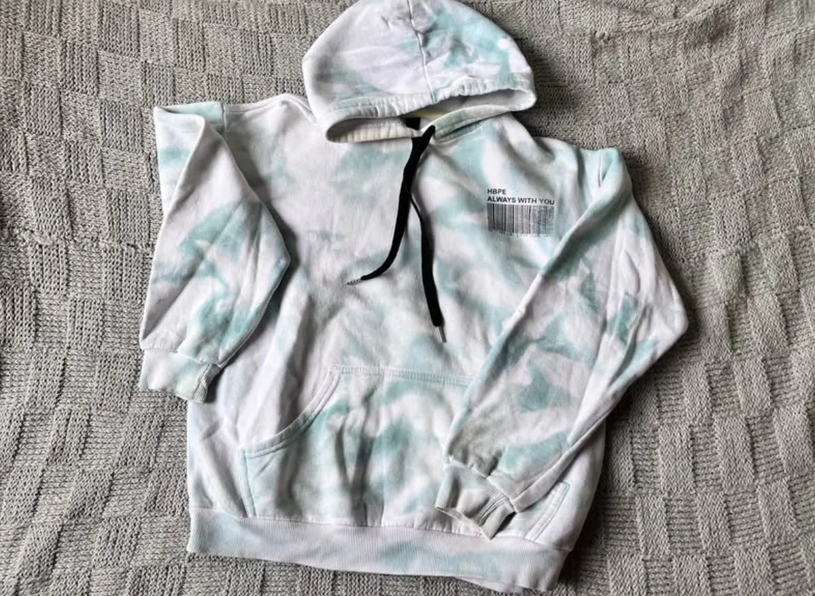 Hoodie oversize con estampa de código de barras y texto "HBPE ALWAYS WITH YOU" y "TOTAL: $0.00". Diseño tie-dye en blanco y verde agua. Ideal para un look urbano y relajado.