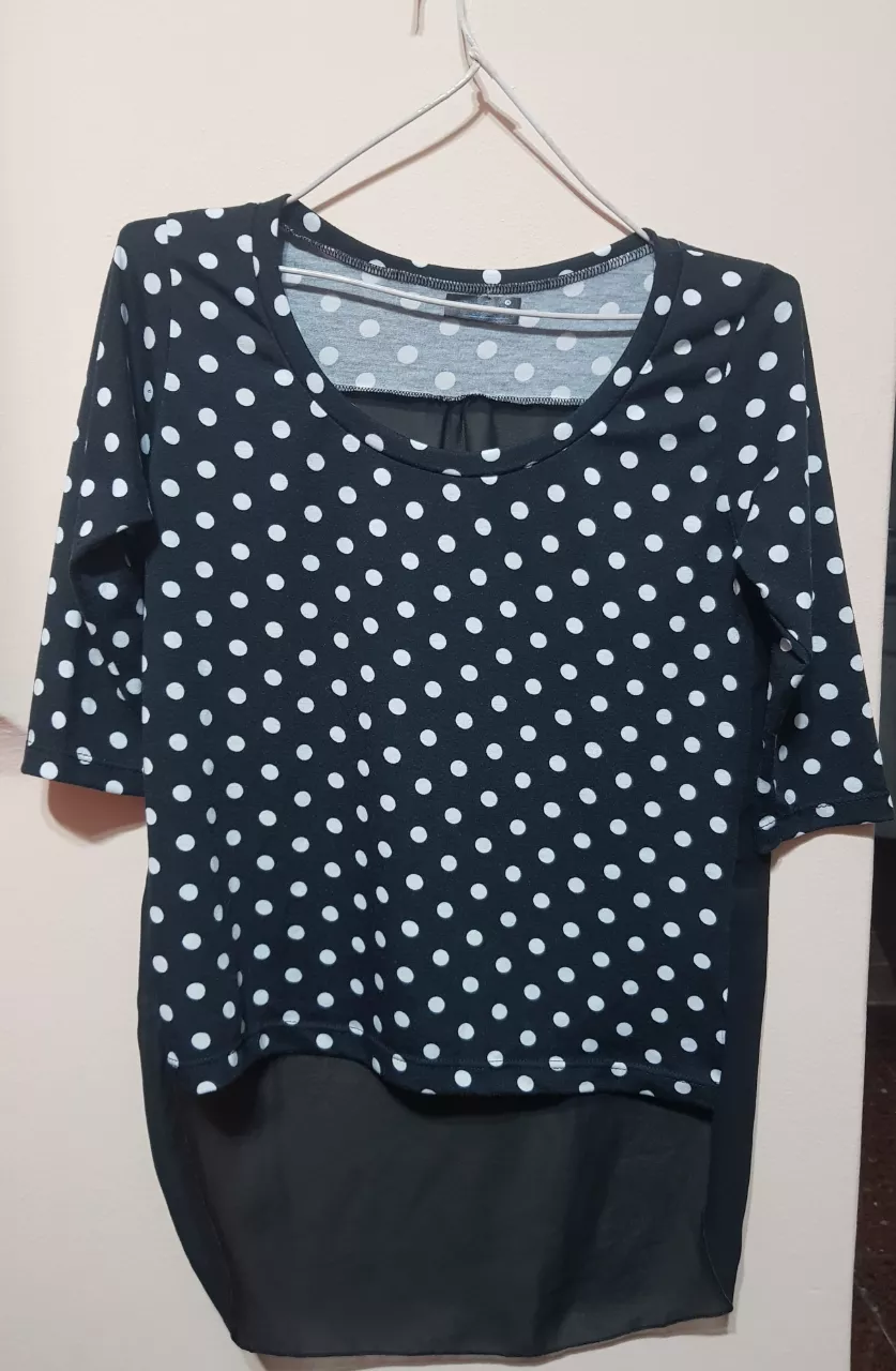 Remera negra con mangas 3/4 y estampa de lunares blancos. Posee un detalle de tela transparente en la parte inferior. Poco uso