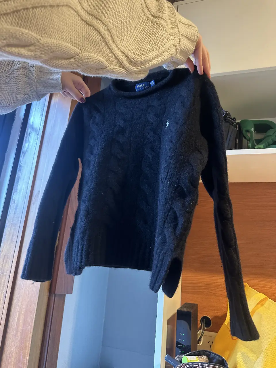Sweater de lana negro de la marca Polo Ralph Lauren, con diseño de trenzas y el logo del caballo bordado. Ideal para un look casual y abrigado.