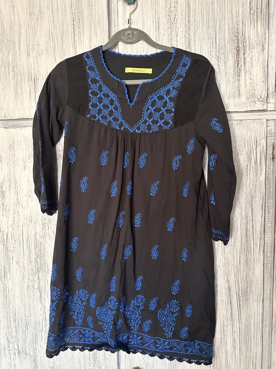 Vestido negro con bordados florales y paisleys en azul vibrante. Diseño con escote en V y mangas largas con detalles de encaje en los puños. Ideal para un look boho chic o casual elegante.