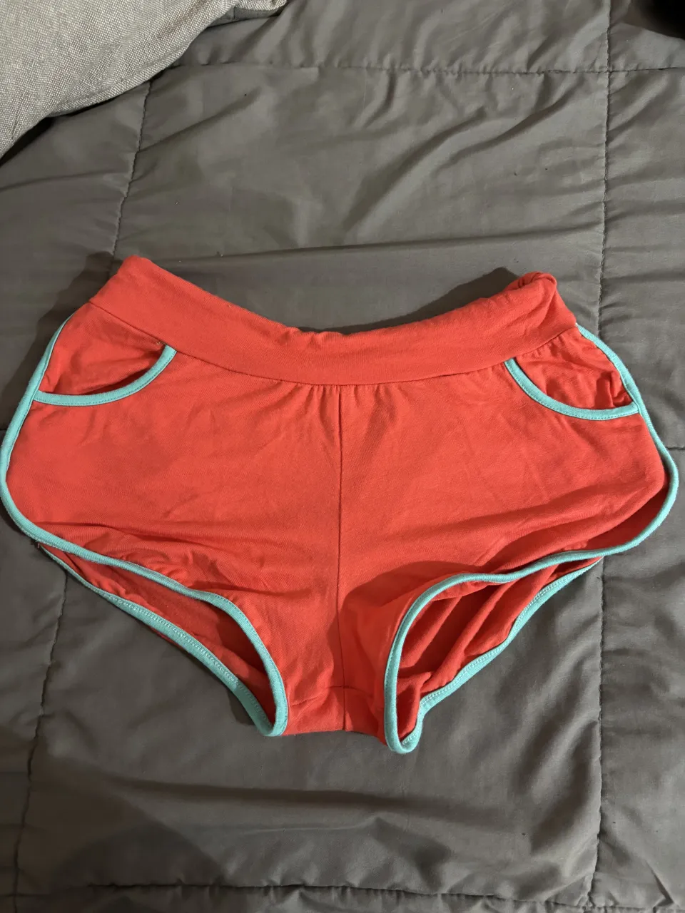 Shorts de algodón color coral con vivos turquesa. Ideales para estar cómoda en casa o para hacer deporte.