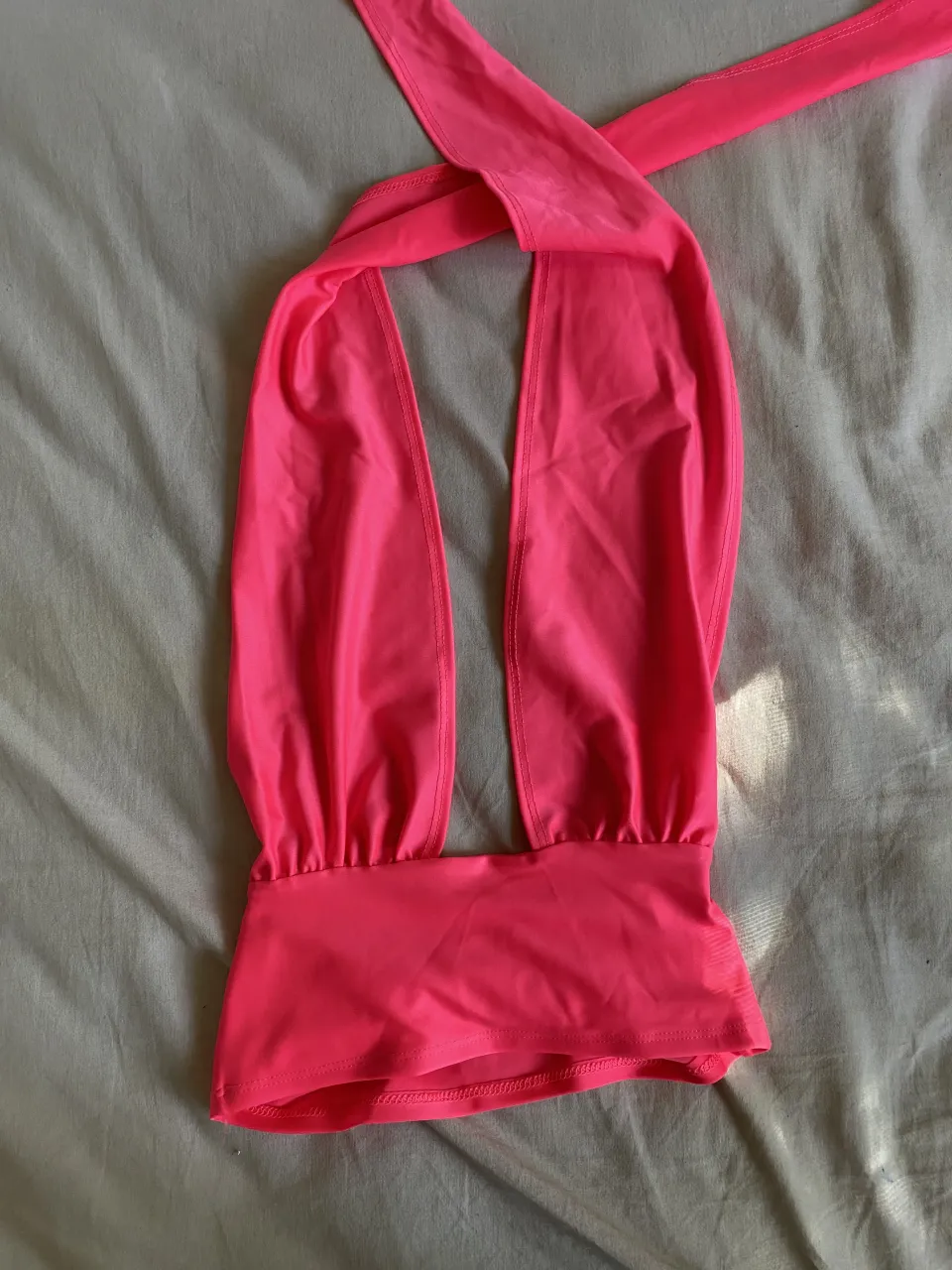 Top rosa neón con escote pronunciado y tiras para atar en el cuello y espalda. (ideal para las fiestas de bariloche)