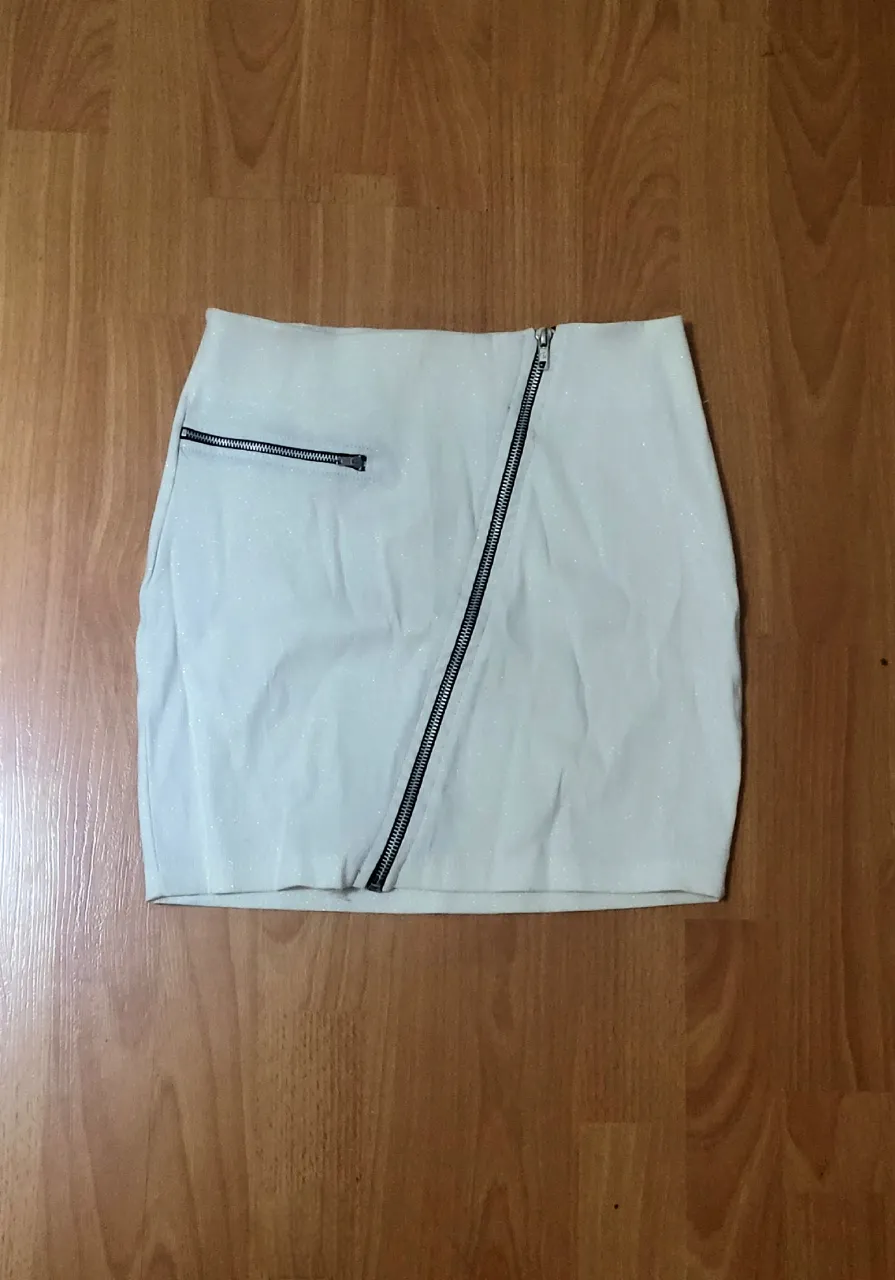 Pollera corta de color blanco con brillos plateados. Tiene un cierre metálico diagonal en el frente y un bolsillo con cierre en el lateral izquierdo. Talle S/M (última foto: así brilla en la oscuridad)