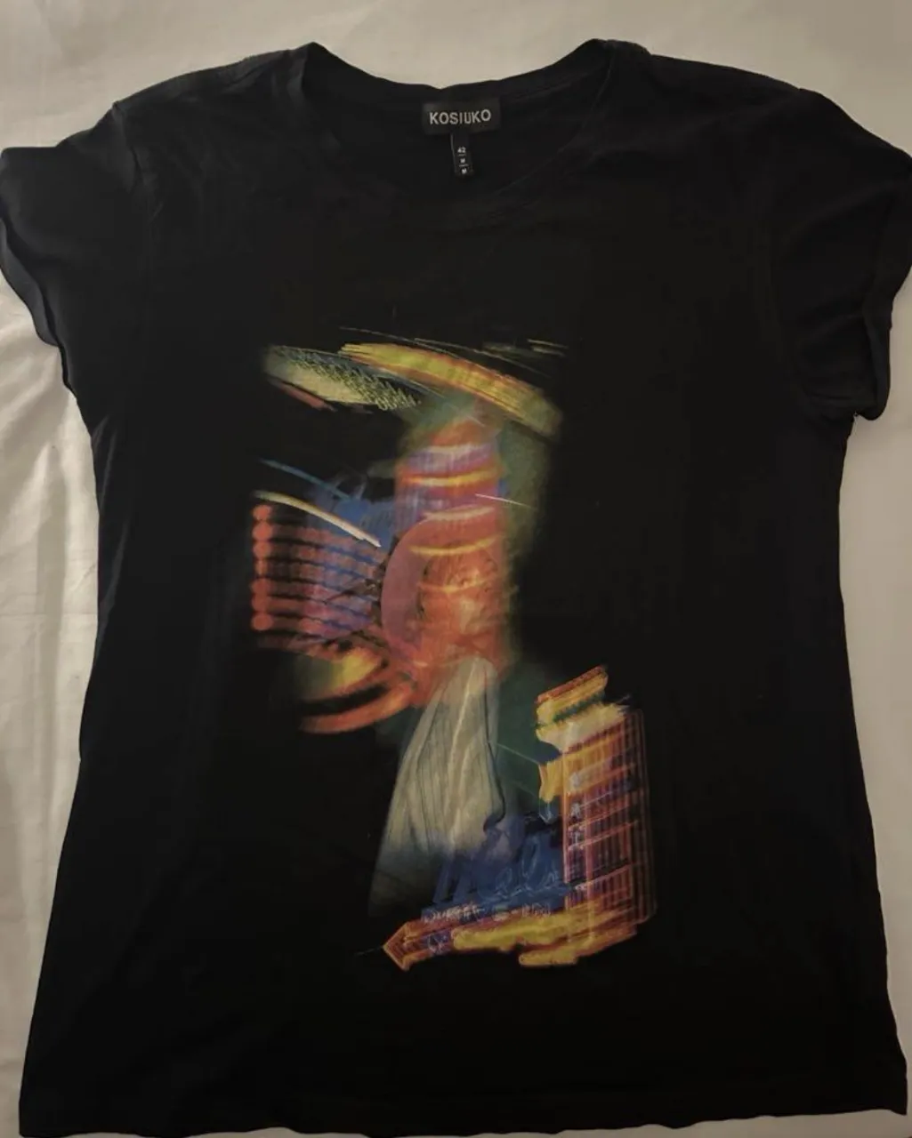 Remera negra con estampa abstracta multicolor en el frente.