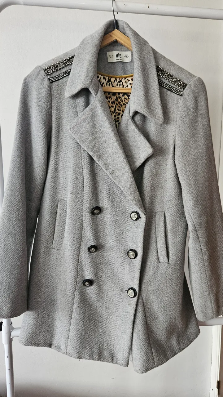 Saco de paño gris melange con doble abotonadura y detalles de pedrería en los hombros. Posee forro interno con estampa de leopardo. Usado en buen estado, tiene un bolsillo descosido.