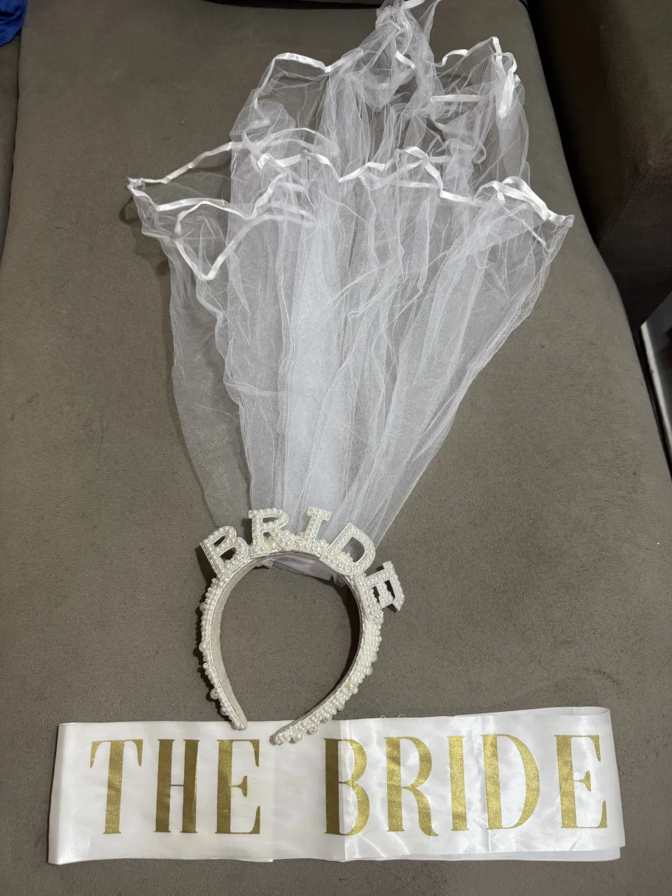 ¡El kit perfecto para la futura novia! Incluye un velo blanco con borde de cinta, una diadema "BRIDE" adornada con perlas y strass, y una banda "THE BRIDE" dorada. Ideal para despedidas de soltera, fiestas temáticas o como accesorio para el gran día. ¡Celebra a la novia con estilo!