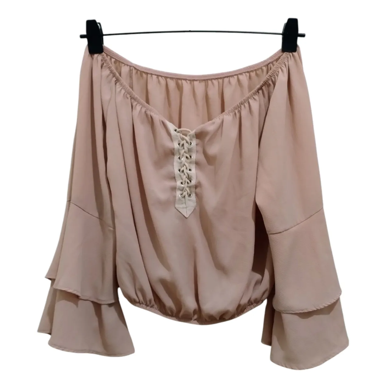 Blusa color rosa pálido, con escote Bardot y detalle de cordones en el frente. Mangas largas acampanadas con doble capa.