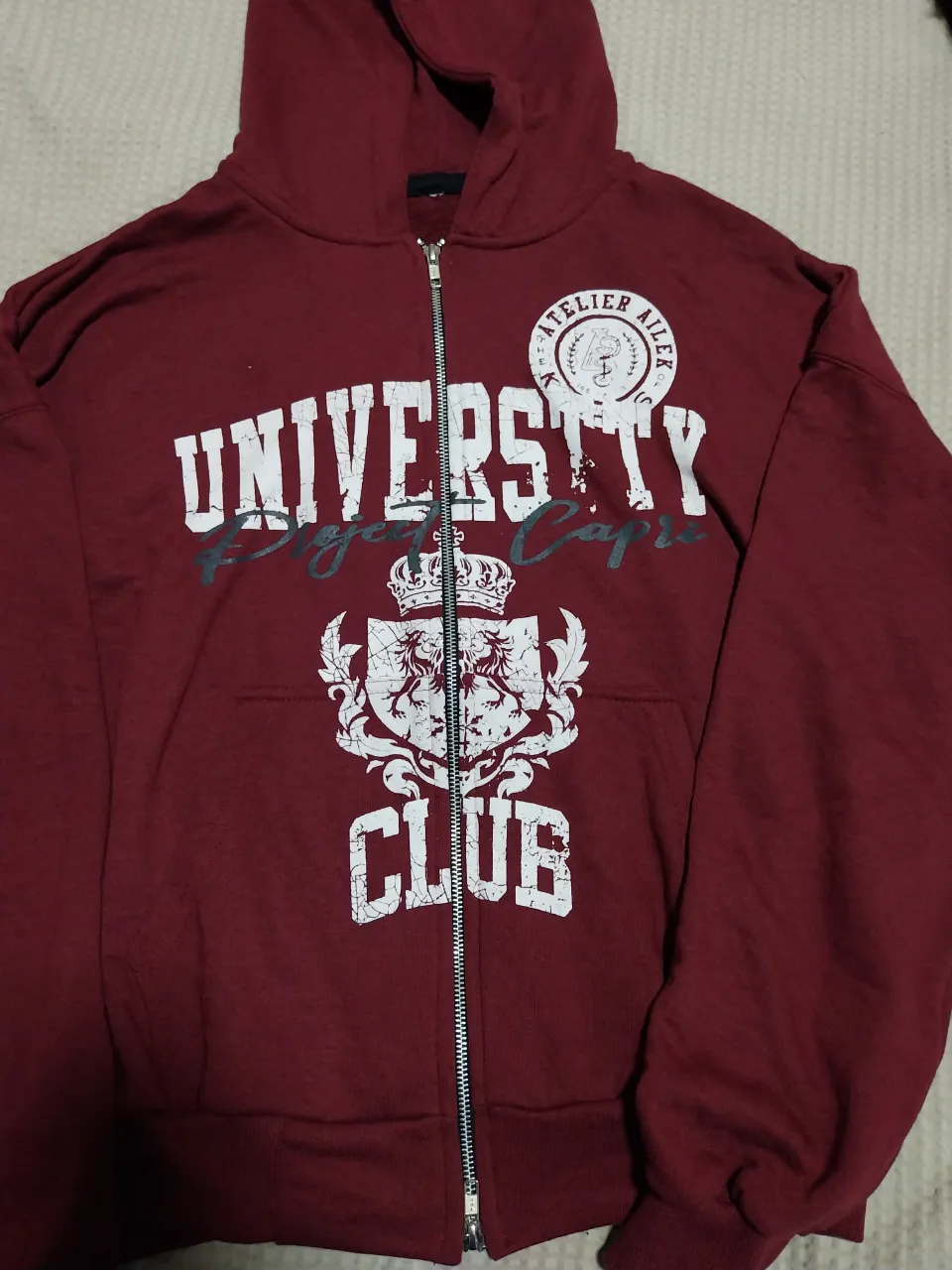 Buzo con capucha y doble cierre. Estampado frontal con texto "UNIVERSITY" y "CLUB" junto a un escudo con leones y coronas.