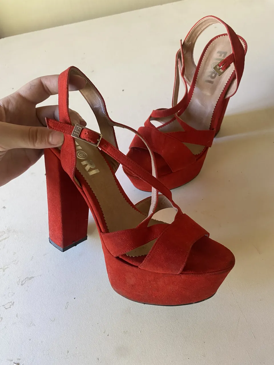 Sandalias rojas de plataforma con taco alto. Tienen tiras cruzadas en el empeine y una tira con hebilla en el tobillo. Ideales para fiestas o salidas.