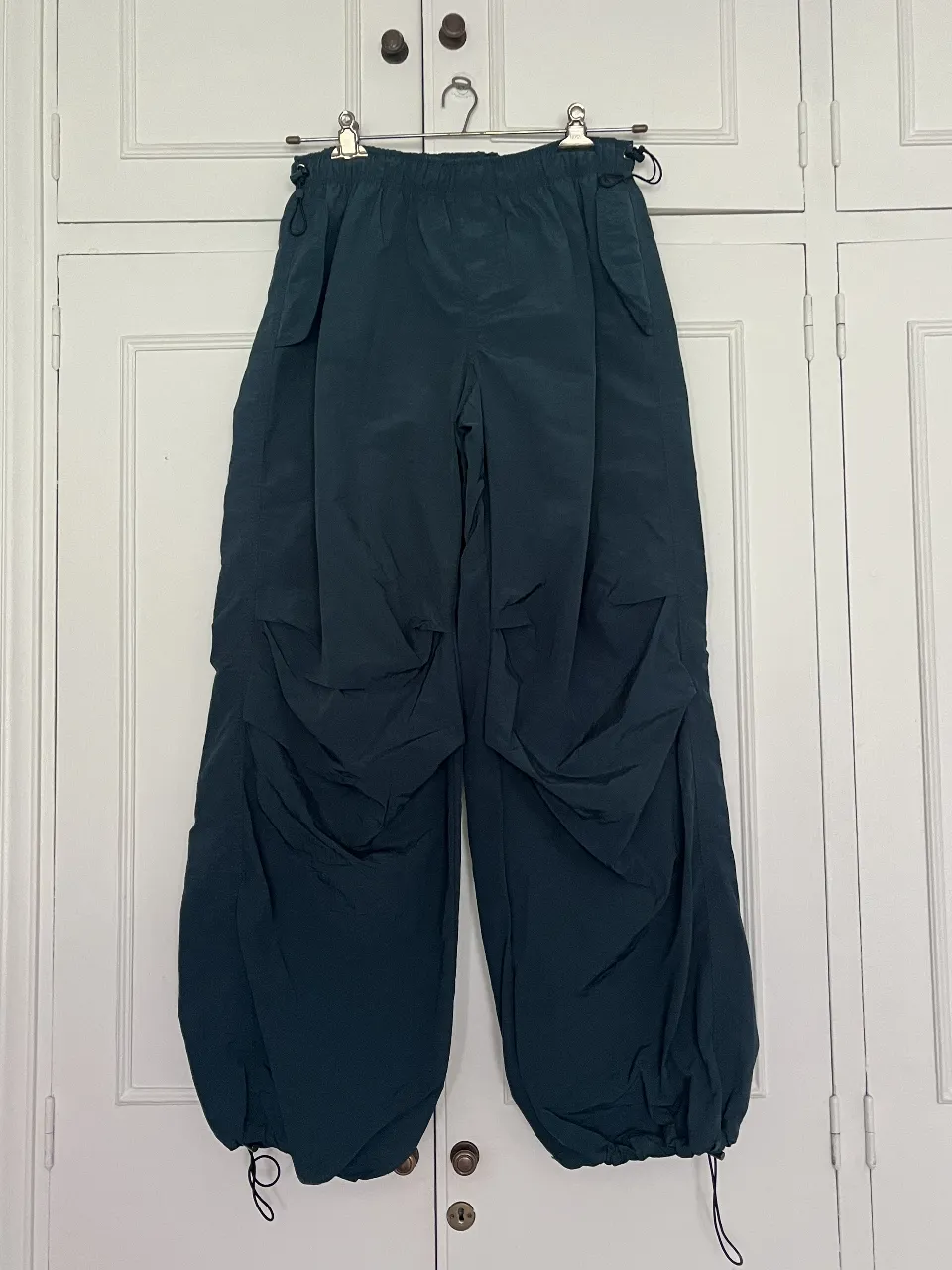 Pantalón cargo ancho de color verde oscuro, con cordones ajustables en la cintura y en los tobillos. Diseño moderno y cómodo, ideal para un look urbano y relajado.