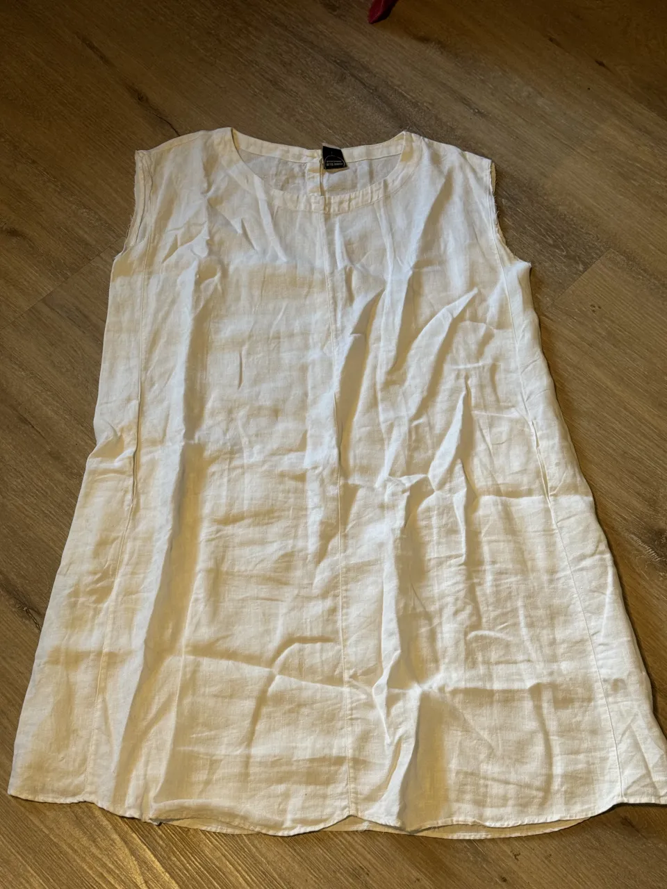 Vestido blanco de lino sin mangas, con botones en la parte trasera. Ideal para un look fresco y casual en días de calor. Es talle 1 pero es muy amplio. manchita en el bolsillo ver segunda foto