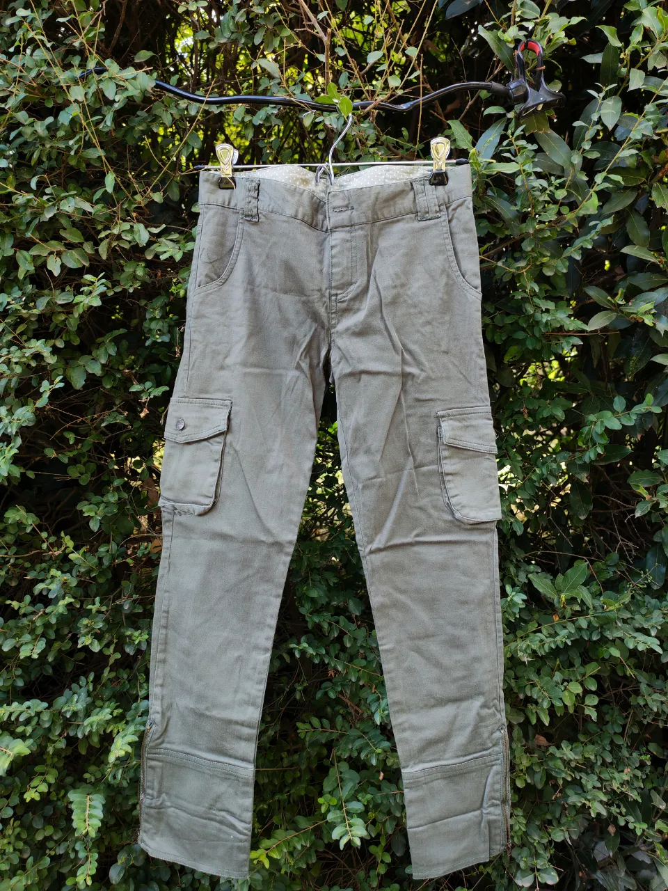 Pantalón cargo de algodón color verde militar, ideal para un look casual y cómodo. Posee bolsillos laterales con tapa y cierres en los tobillos para un ajuste personalizado. Perfecto para el día a día o actividades al aire libre.