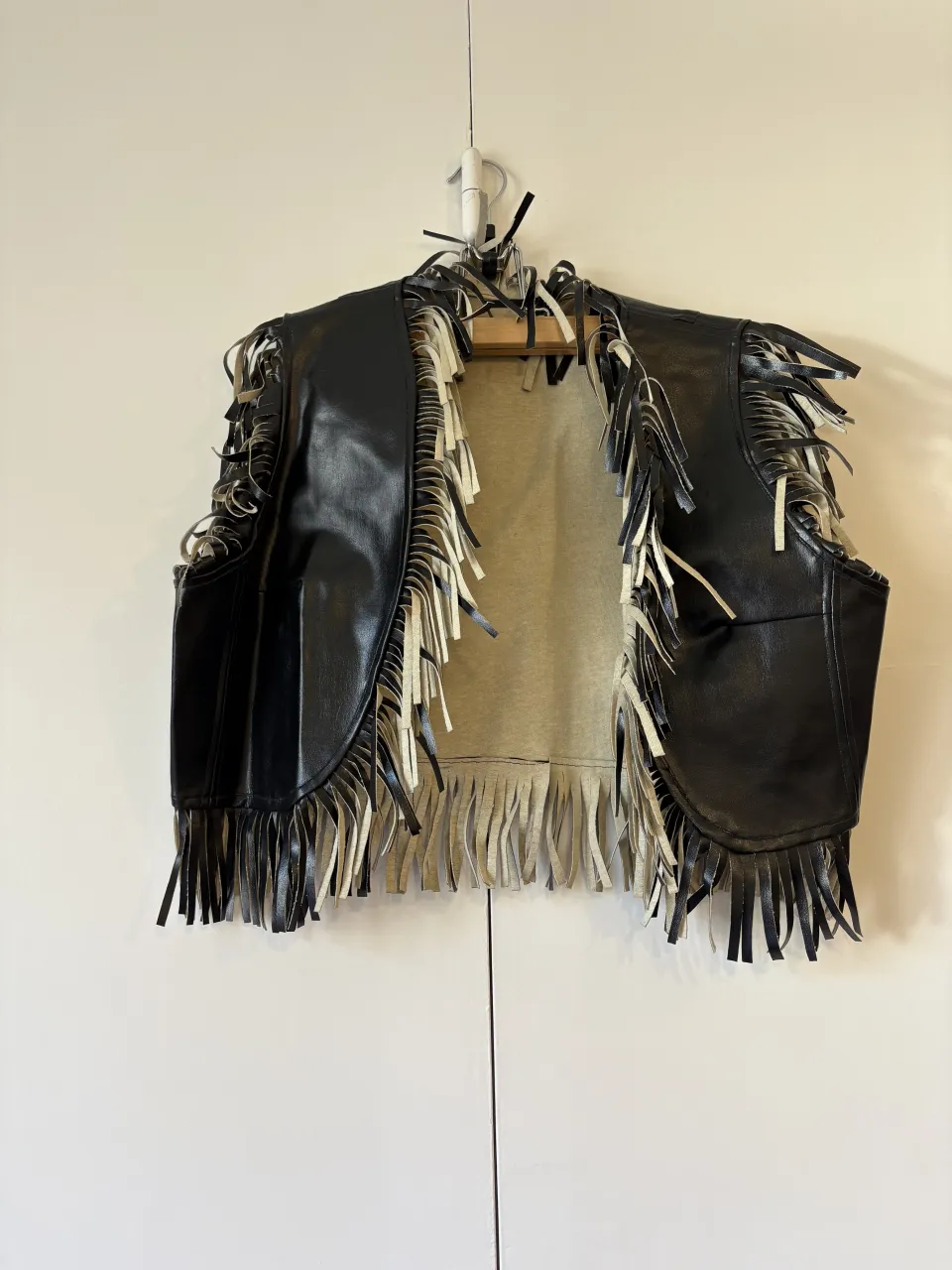 Chaleco negro cuerina con flecos en los bordes y en la parte inferior. Posee un forro interior color crudo. Medidas: 59cm axila axila, 40cm largo
