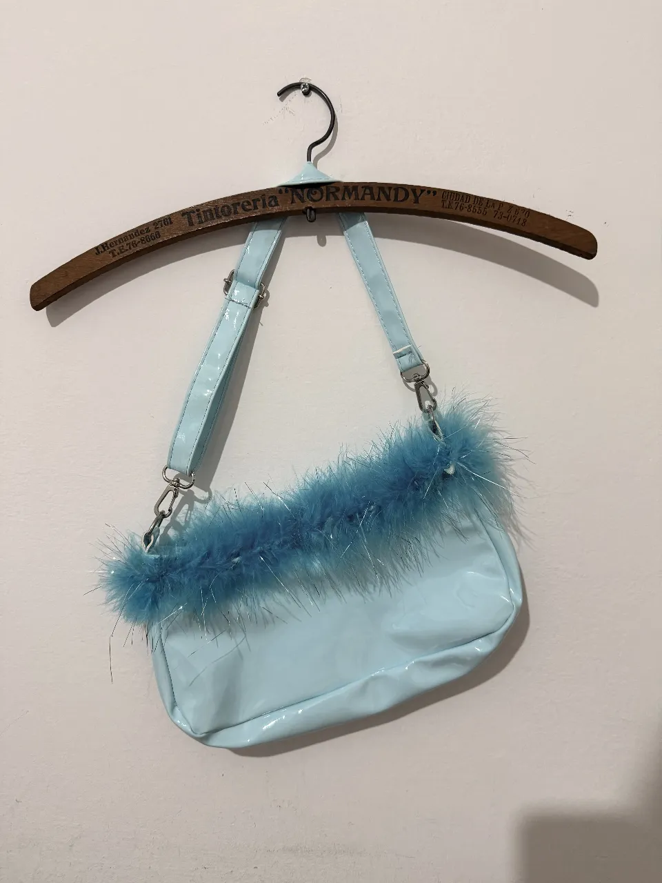 ¡Atrévete con esta cartera baguette súper canchera y a la moda! Su diseño en charol celeste pastel con detalles de pelo sintético azul vibrante la hace única. Perfecta para darle un toque Y2K y divertido a tus looks de salida o fiesta. ¡No te quedes sin la tuya!