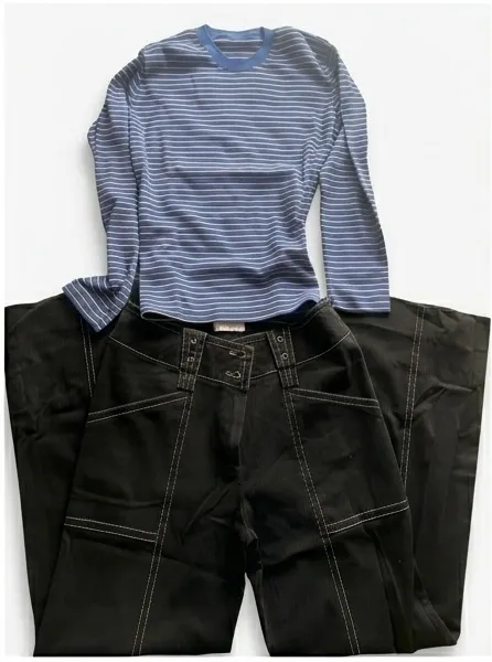 Conjunto de remera a rayas azules y blancas con pantalón negro tiro alto. La remera es de manga larga y cuello redondo. El pantalón es ancho, con detalles de costuras blancas y dos botones en la cintura.
