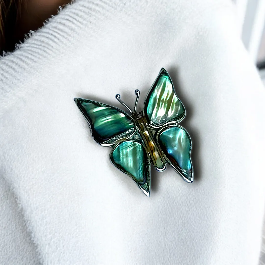 Broche de mariposa con detalles en verde y azul, de alpaca mexicana. Ideal para darle un toque especial a cualquier outfit.