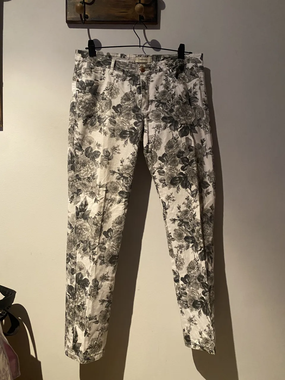 Pantalón de jean blanco con estampa floral en tonos grises y negros. Cierre y botón.