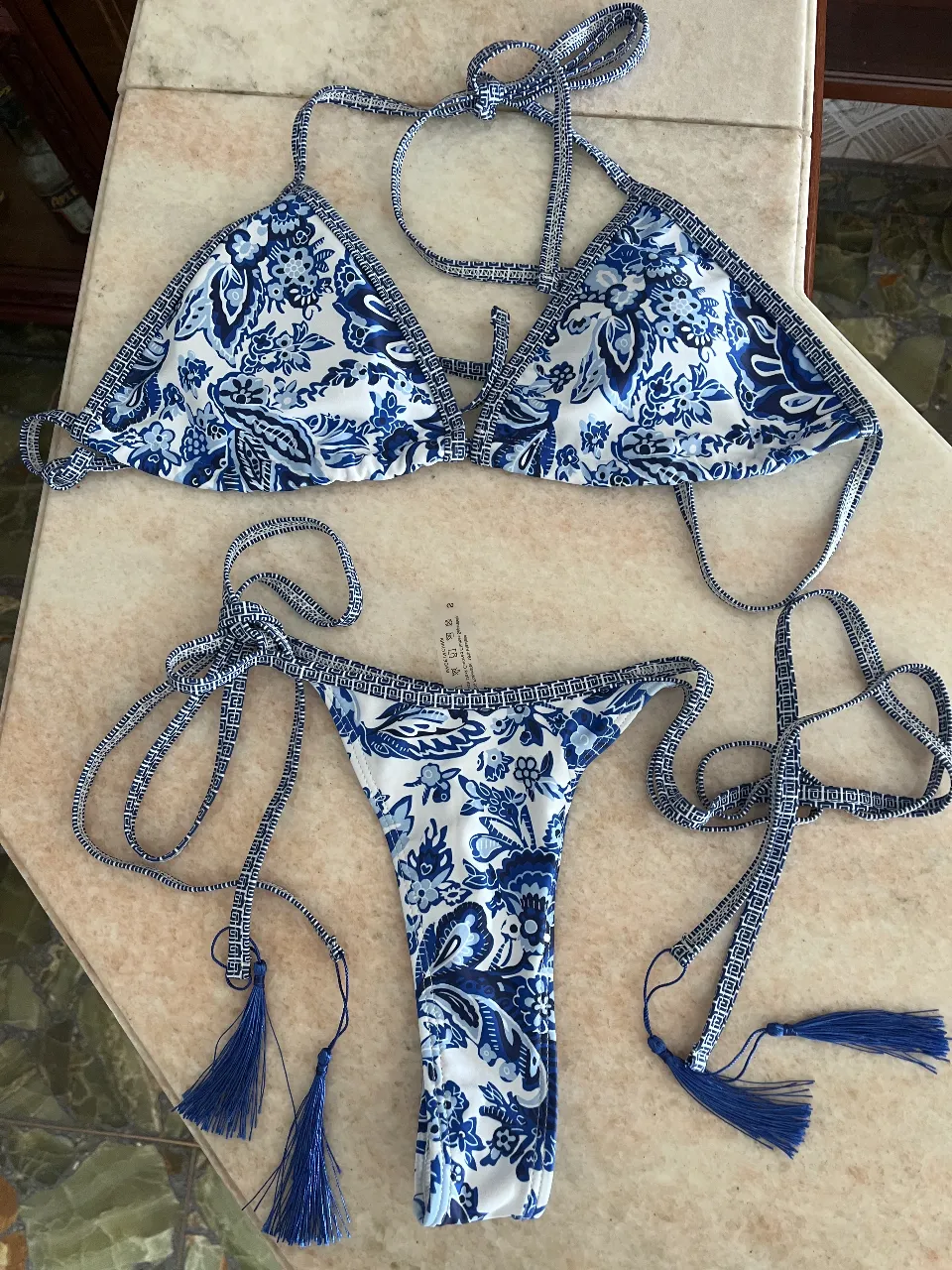Conjunto de bikini estampado floral en tonos azules y blancos. La parte superior es un corpiño triangular con tiras finas y detalles de flecos. La parte inferior es un culotte con tiras laterales y también con flecos. Ideal para un look playero y fresco.