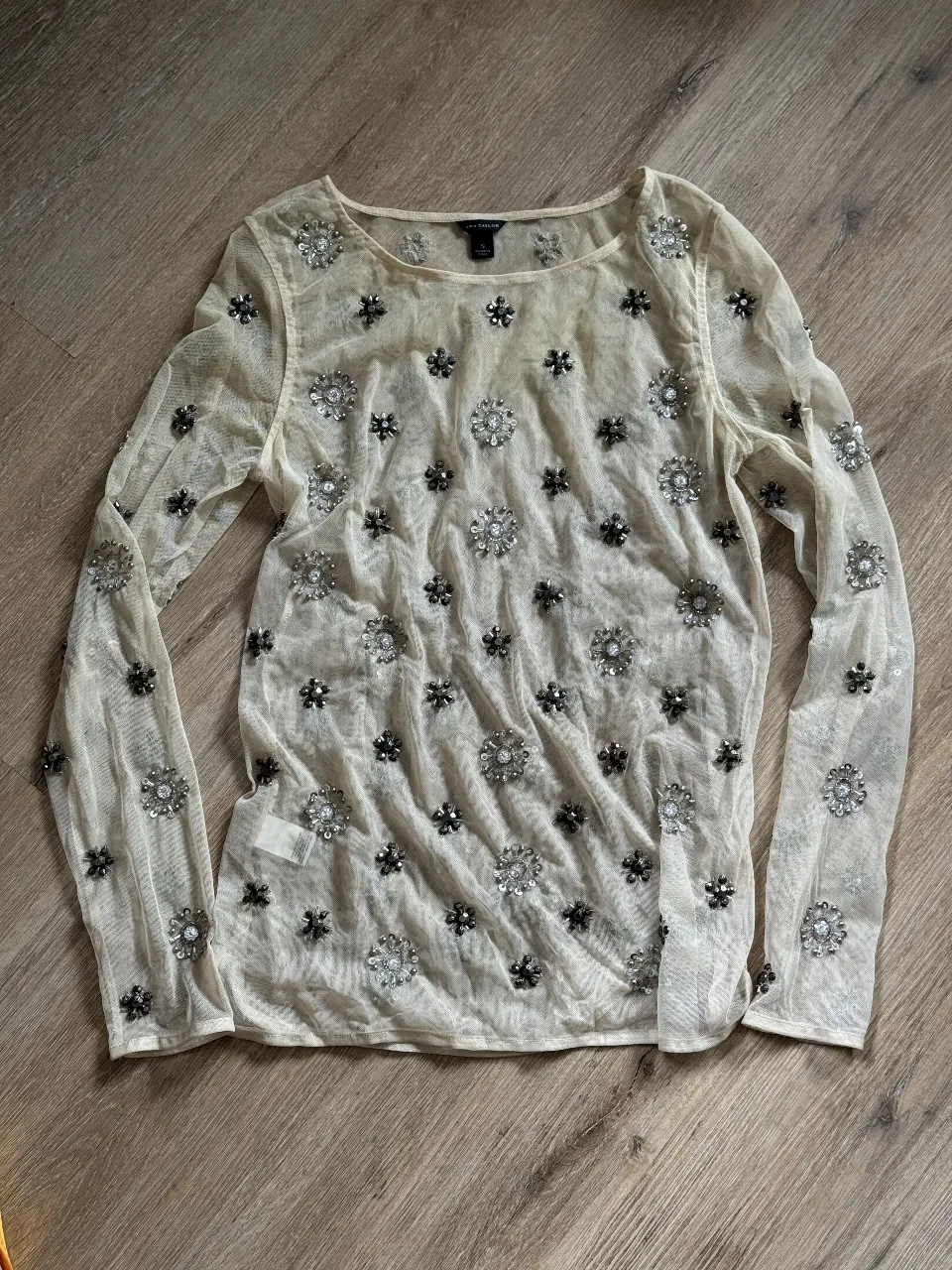 Blusa de manga larga color tiza, con un delicado bordado de flores y lentejuelas plateadas y negras. Transparente, ideal para usar sobre otra prenda o para un look de noche.