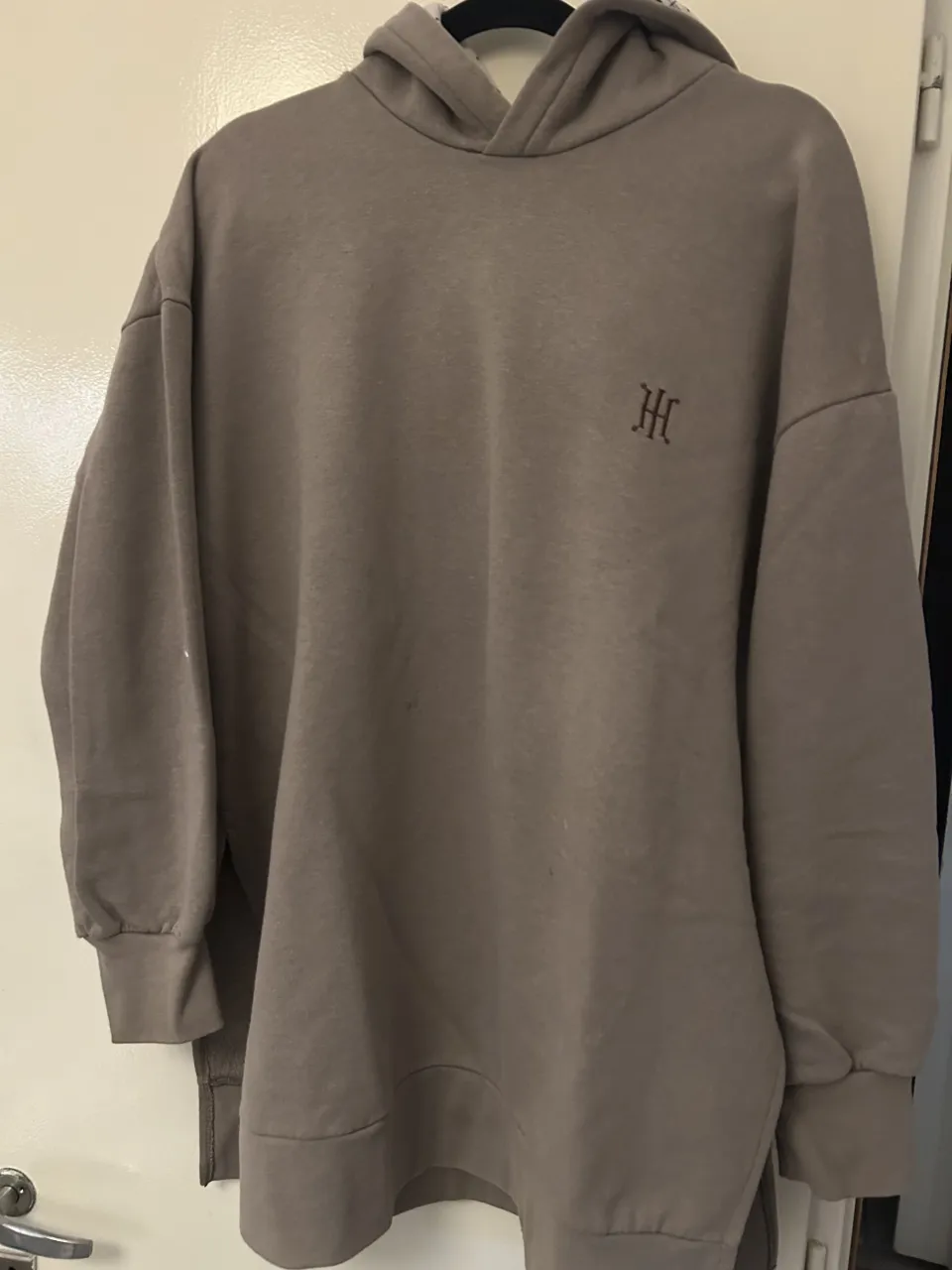 Buzo oversize de color gris con capucha y logo bordado en el frente. Interior de friza marca helicia.