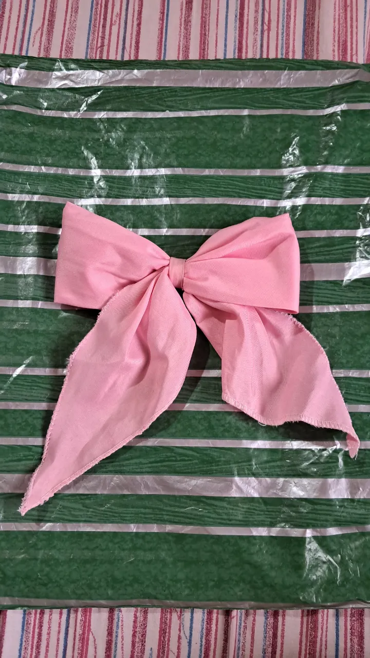 Moño rosa de tela, ideal para el pelo. Se puede usar para sujetar una cola de caballo o como accesorio en peinados.