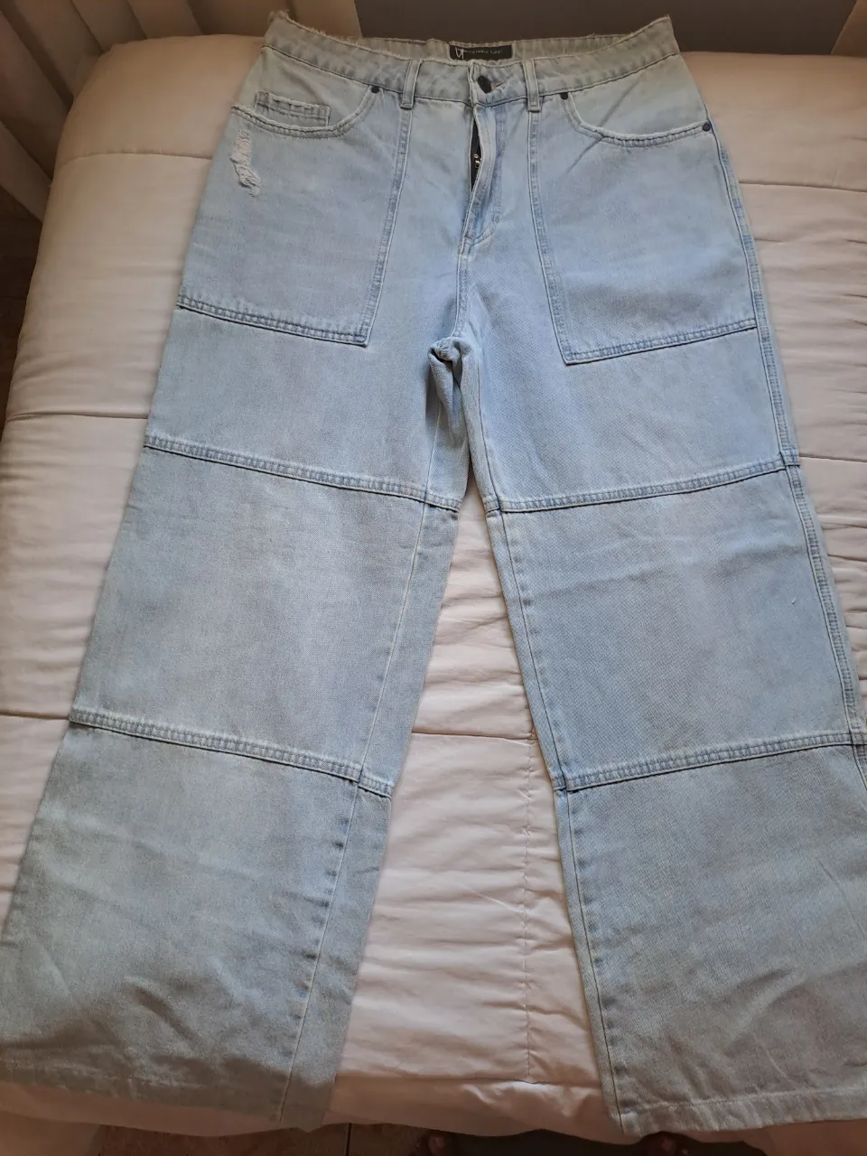 Jeans tiro alto, corte ancho y desgastado, con detalles de costuras y bolsillos utilitarios. Un básico canchero para tu día a día.Tiene una manchita(foto)talle 30
