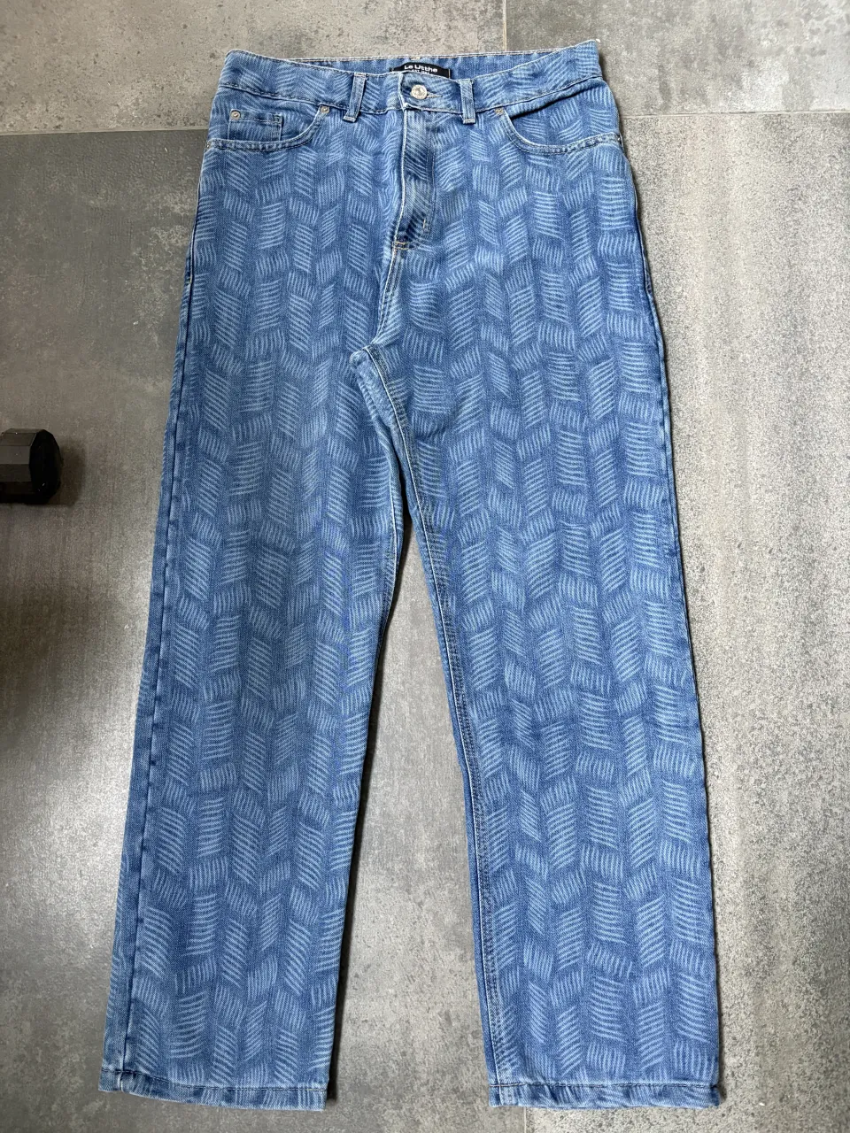 Jean de denim azul con estampado geométrico repetido en toda la prenda. Bolsillos en la parte delantera y trasera. Cierre metálico y de botón.