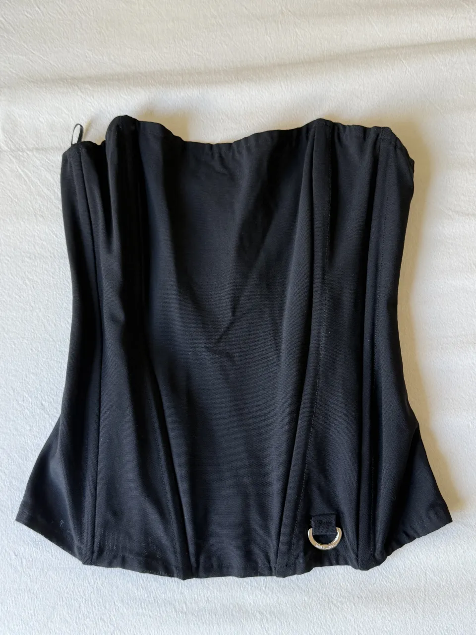 Top negro estilo corset con cierre en la espalda y detalle de aro metálico en la parte delantera.