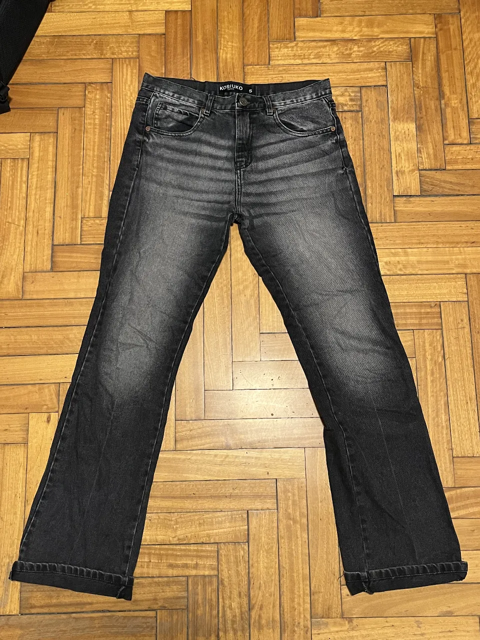 Jeans tiro medio bajo con corte recto y leve acampanado en la botamanga. Lavado oscuro con detalles desgastados y efecto vintage. Perfectos para un look casual y moderno.