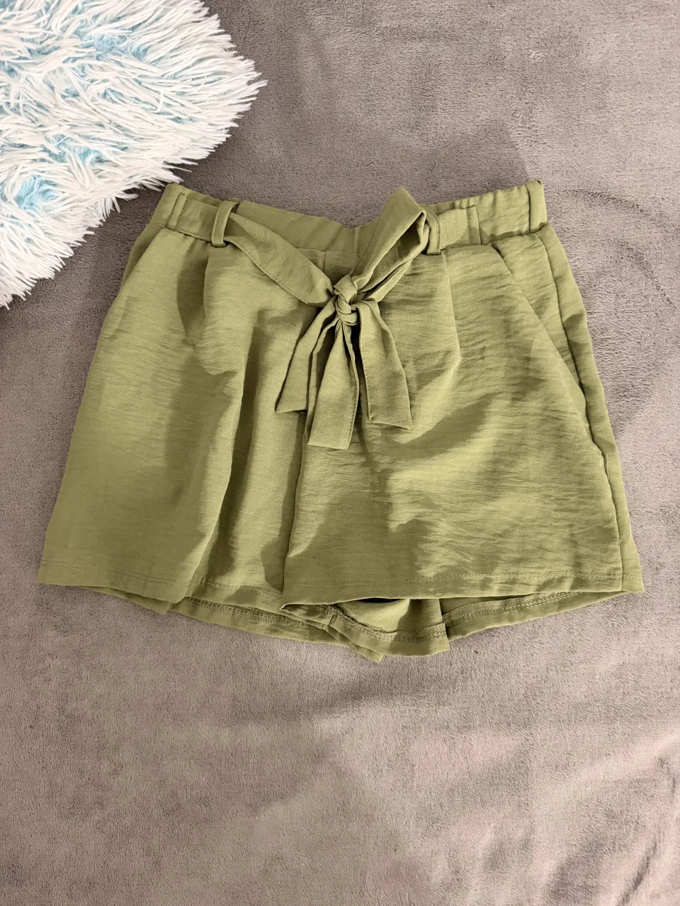 Shorts de tela color verde con lazo en la cintura. Ideales para un look casual y fresco.