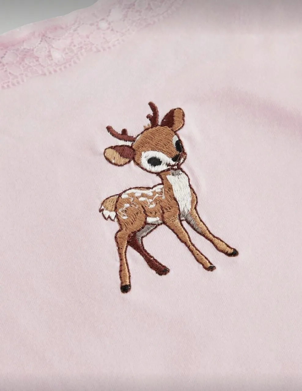 Conjunto de pijama de dos piezas color rosa. Incluye un top de breteles finos con detalles de encaje en el borde superior y un lazo marrón en cada bretel. El top tiene un bordado de un cervatillo en el frente. El segundo ítem son shorts con cintura elastizada y fruncida, con tres botones pequeños en la parte delantera. Los shorts tienen un estampado repetido de pequeños cervatillos.