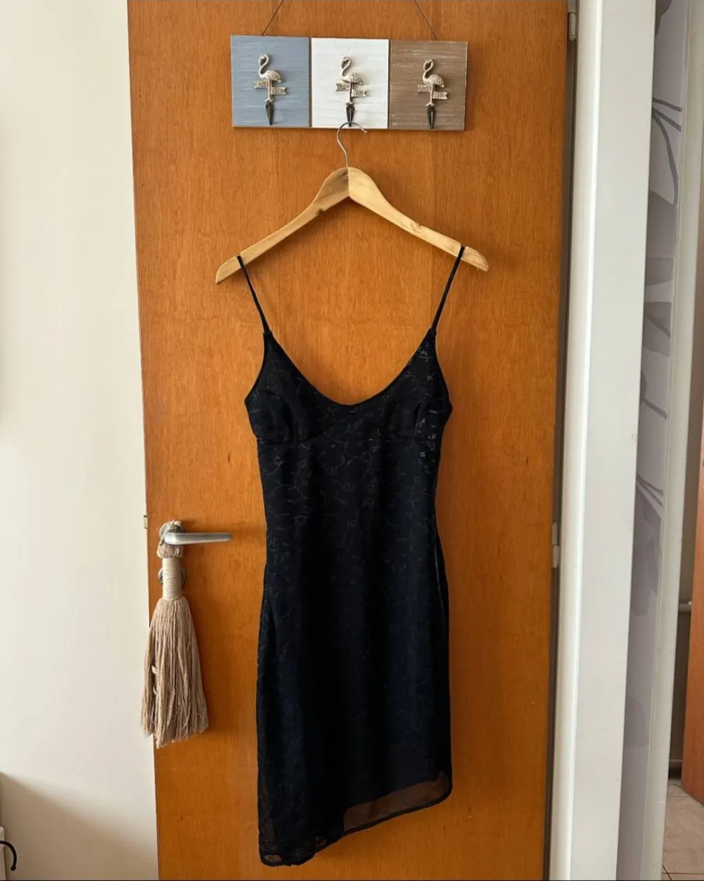 Vestido negro corto con tiras finas y estampado floral sutil. Diseño asimétrico y tela microtul con forro interno con detalles labrados brillantes, ideal para una salida nocturna o una fiesta. Con tajo en el costado, la tela tiene elasticidad, es hermoso nunca lo use.