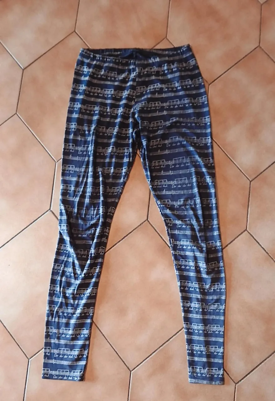 Calza Converse largas estampadas con motivos musicales y partituras en tonos azules y blancos. 34 cm de cintura en plano 97cm largo total. No dice talle.