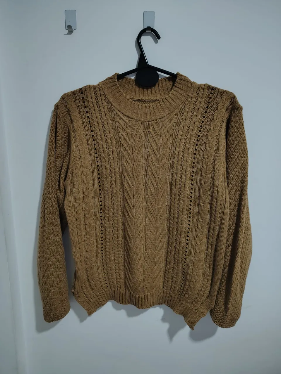 Sweater de tejido rústico en color marrón. Posee un diseño de trenzas y detalles calados en los laterales. Cuello redondo y mangas largas. Ideal para un look casual y abrigado.