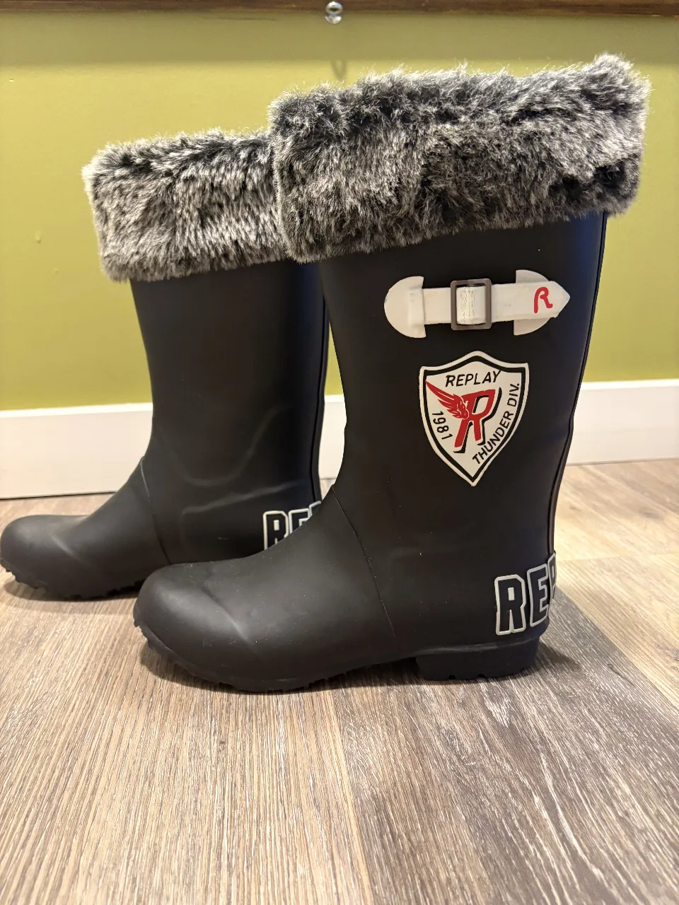 Botas de lluvia negras con detalles de peluche gris en la parte superior. Tienen un diseño moderno y son perfectas para días lluviosos o para un look urbano con un toque canchero. La marca Replay está estampada en la parte trasera.
