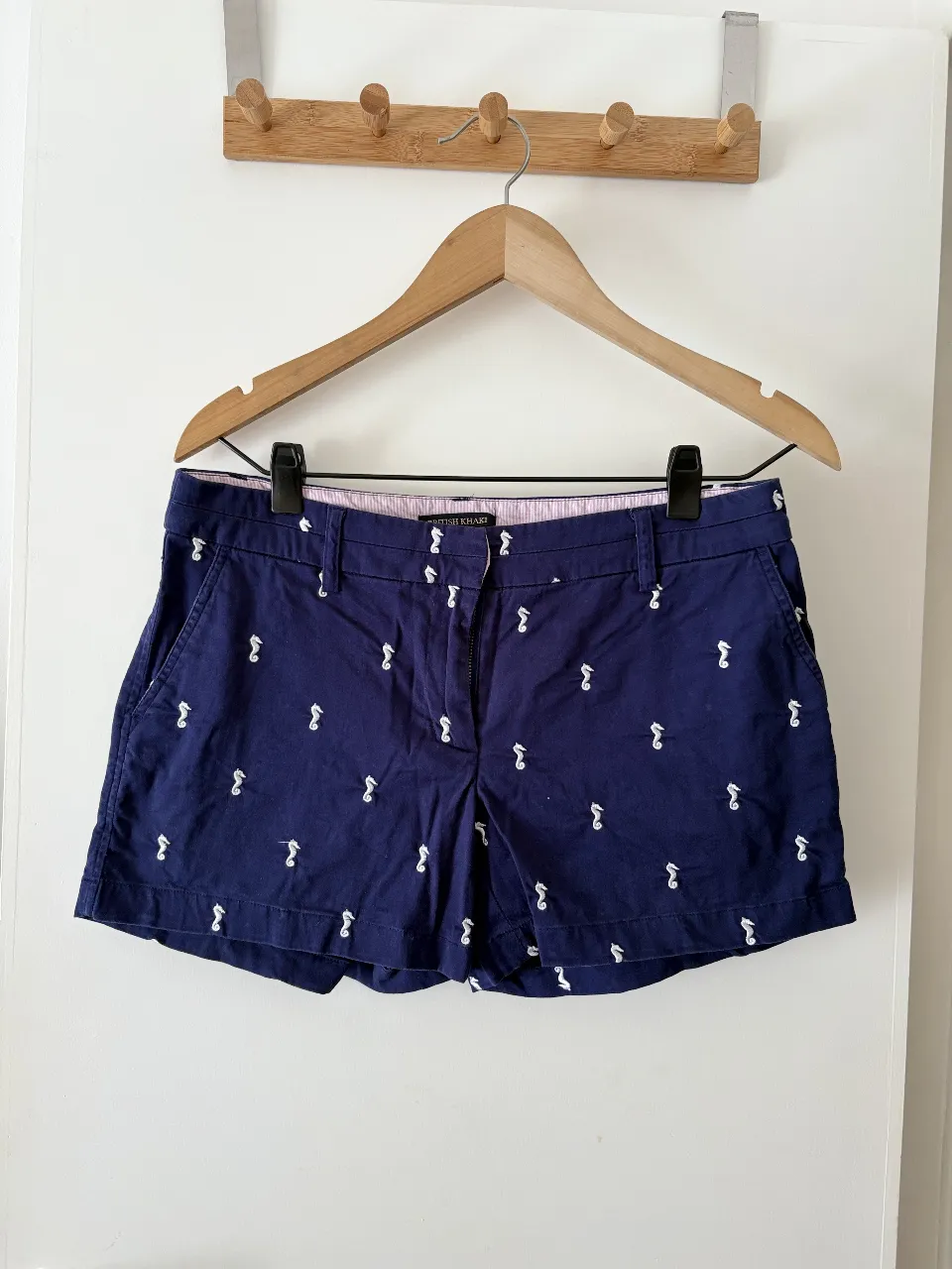 Shorts de gabardina azul marino con estampa de caballitos de mar blancos. Tiro medio, con bolsillos y detalles de botones. Talle US 8