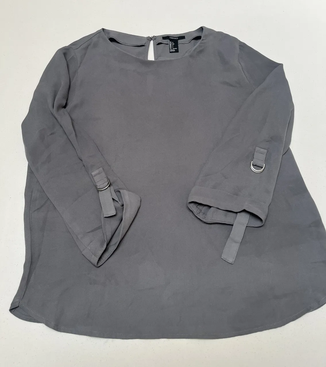 Blusa gris de manga 3/4 con detalles en los puños. Ideal para un look casual o de salida.