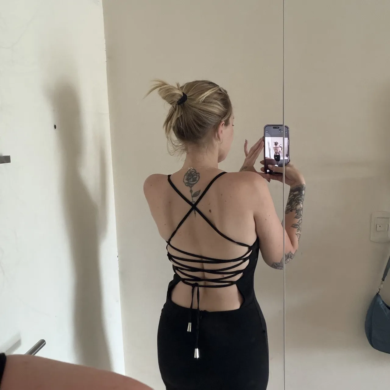 Vestido negro corto con tiras cruzadas en la espalda y detalle metálico. 1 solo uso. es un M chico