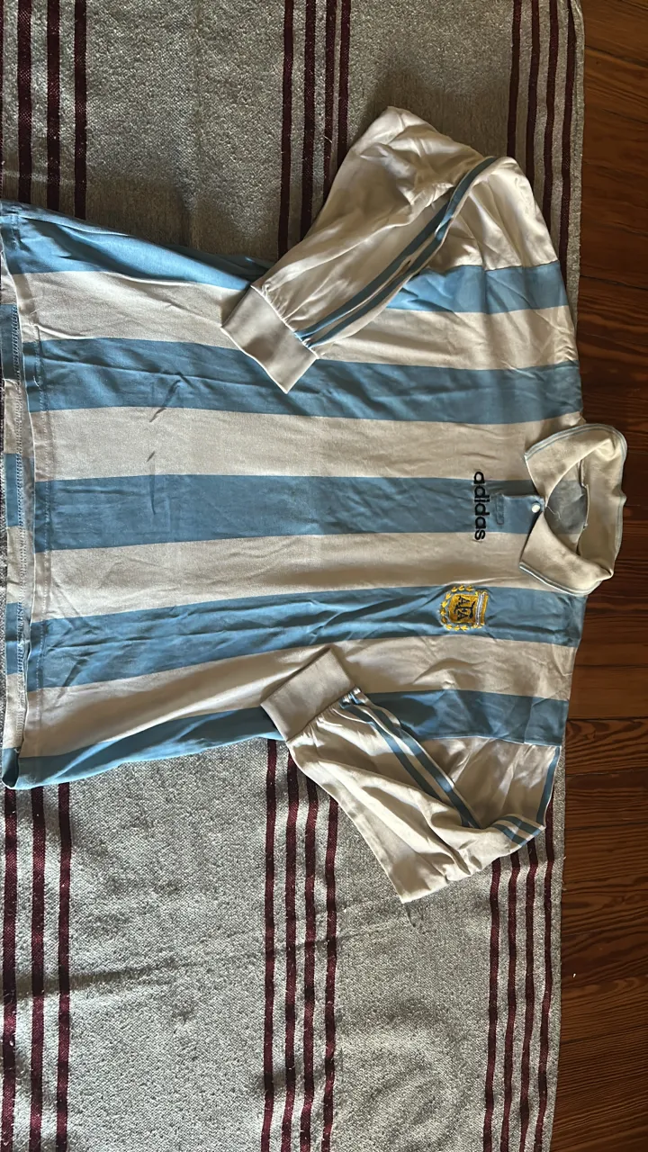 Remera de manga larga a rayas celestes y blancas. Tiene cuello tipo polo con botones y el logo de Adidas bordado en el frente. año 1994 original