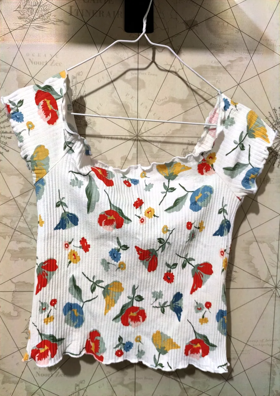 Remera blanca con estampa floral de flores rojas, azules y amarillas. Posee cuello y mangas con terminación volado.