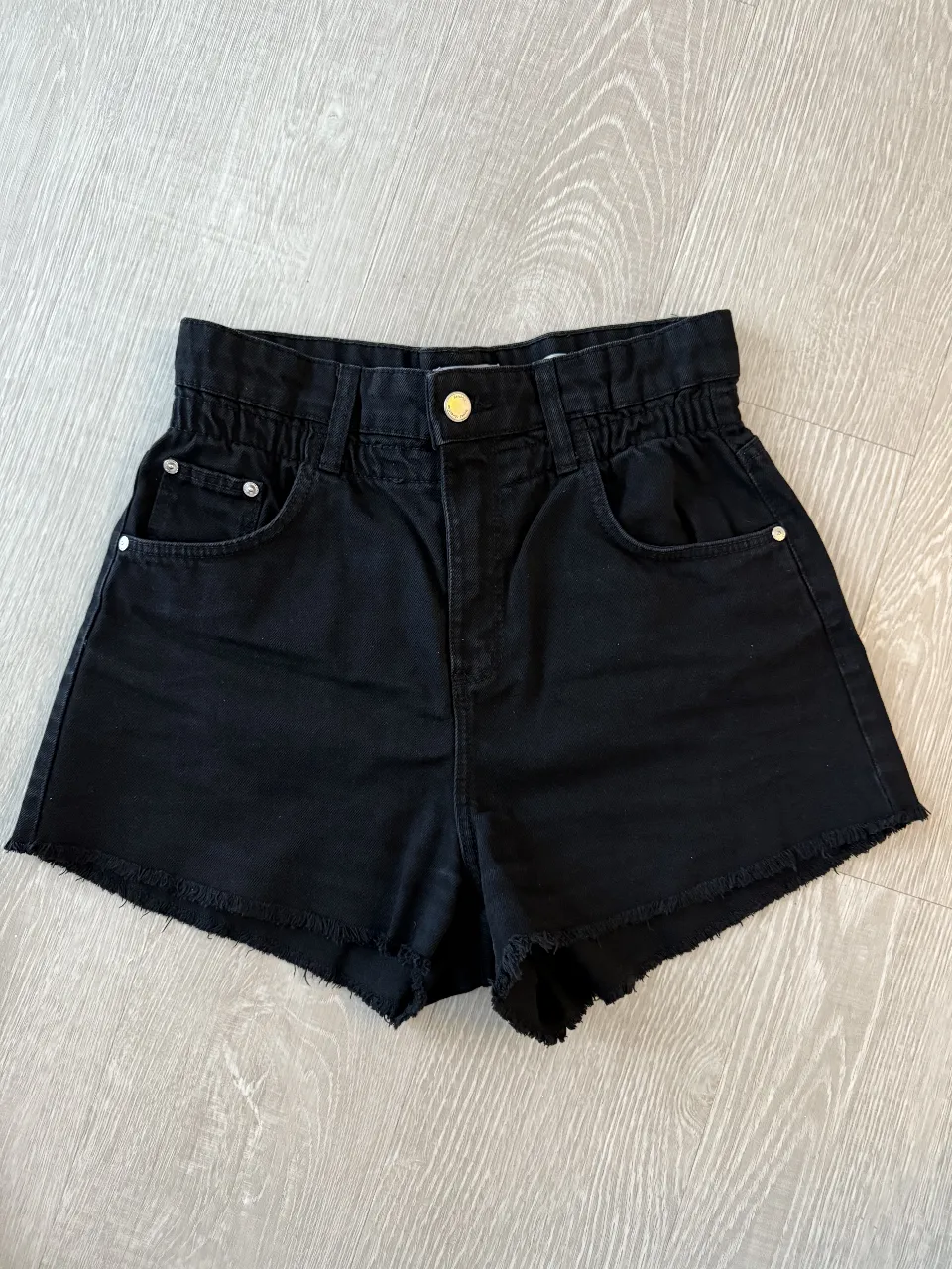 Shorts de jean negros tiro alto con cintura elastizada y detalles desflecados en el ruedo. Tienen bolsillos delanteros y traseros, y un botón dorado en la bragueta. Son súper cómodos y versátiles, ideales para un look casual de día o de noche.