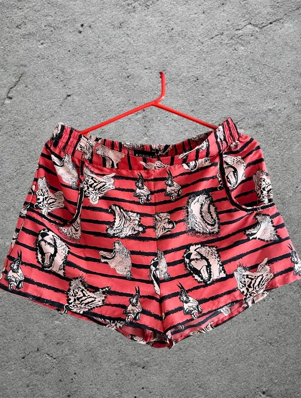 Shorts de frisa con estampa de tigres y rayas. Detalle de lentejuelas alrededor de uno de los tigres.