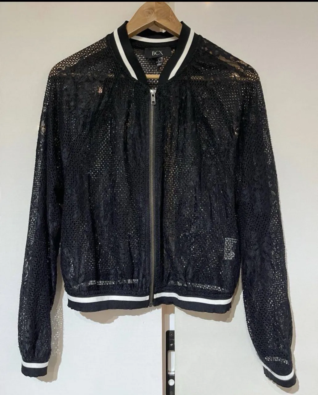 Campera bomber de encaje negra con cierre al frente y puños y cuello de ribb blanco y negro.