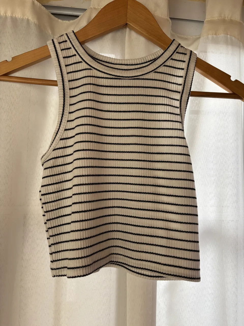 Musculosa a rayas blancas y negras. Tiene cuello redondo y es de tejido acanalado. MEDIDAS (son aproximadas) Sisa: 31cm Largo total (desde el hombro): 38cm Materiales: 100% algodón