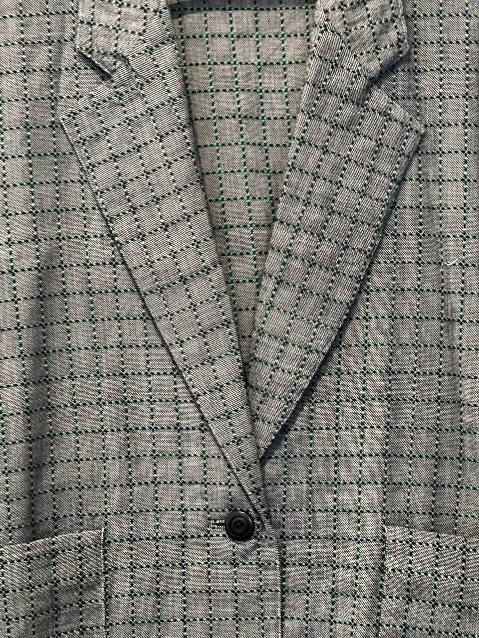 Blazer de tela a cuadros grises con detalles en verde. Posee un solo botón al frente y bolsillos a los costados. Ideal para un look casual o de trabajo.