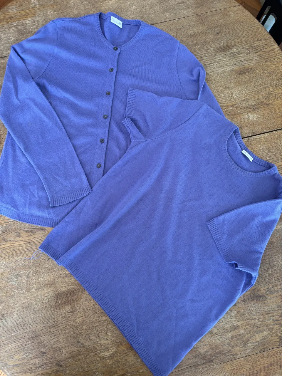 Conjunto de cardigan y sweater de lana y acrílico en color violeta. El sweater es de manga larga y tiene botones al frente. El sweater es de manga corta. medidas: siza 48cm, largo 57cm detalles: muestro en foto una mancha del cardigan y un desgaste del sweater