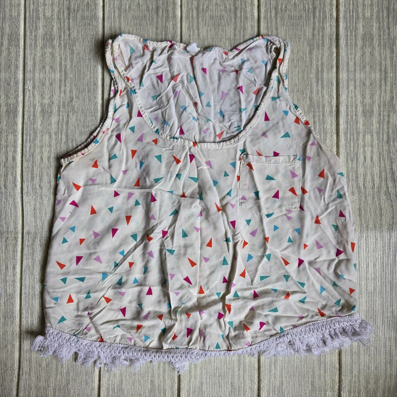 Musculosa súper canchera con estampa de triángulos de colores. Tiene un detalle de puntilla en el ruedo que la hace única. Ideal para los días de calor, para usar en la playa o para un look casual y divertido.